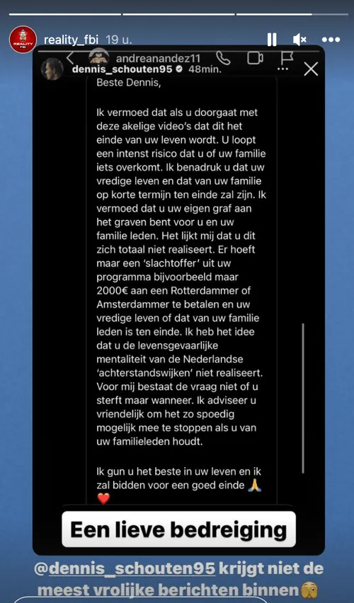 "Ik vermoed dat als u doorgaat met deze akelige video's dat dit het einde van uw leven wordt. U loopt een intenst risico dat u of uw familie iets overkomt. Ik benadruk u dat uw vredige leven en dat van uw familie op korte termijn ten einde zal zijn. Ik vermoed dat u uw eigen graf aan het graven bent voor u en uw familie leden. Het lijkt mij dat u dit zich totaal niet realiseert. Er hoeft maar een 'slachtoffer' uit uw programma bijvoorbeeld maar 2000€ aan een Rotterdammer of Amsterdammer te betalen en uw vredige leven of dat van uw familie is ten einde".