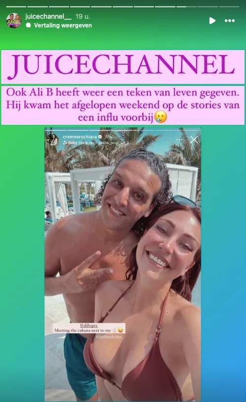 brasserie van Nicolette van Dam. De Nederlandse muziekmogul werd deze week weer gespot op een foto, dit keer in Dubai met een realityster. Ali zou namelijk naast de cabana van Chiara Creemers liggen, een voormalige