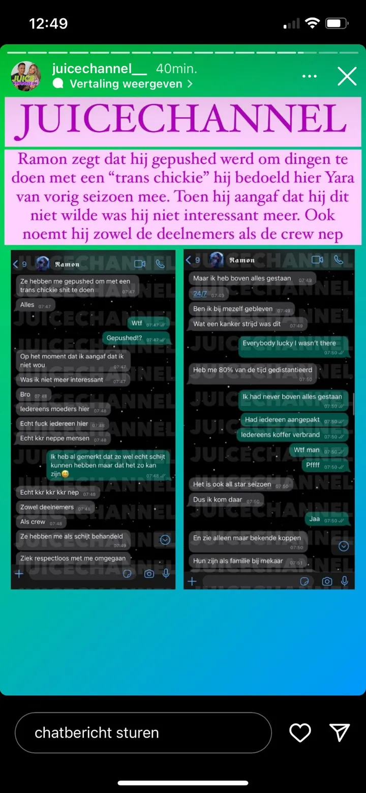 Zo vertelt hij dat de productie hem gepusht heeft om dingen te met de transgender deelneemster Yara-Nour. Hij zou aangegeven hebben dit niet te willen doen, met als gevolg dat de producers hem niet meer interessant vonden. Ramon zag Yara-Nour als een gelijkwaardig persoon en wilde haar met respect behandelen. 'Ze hebben me gepushed om met een trans chickie shit te doen. Alles. Op het moment dat ik aangaf dat ik niet wou, was ik niet meer interessant.' Ook gaf hij aan dat hij open minded is, maar dat het niet betekent dat hij dan vervolgens seks wilt hebben met een transgender vrouw. 'Ik kom daar en zeg dat ik open minded ben. En daarmee denken ze meteen dat ik de lul van een trans wel in me wil. Ben je gek.'