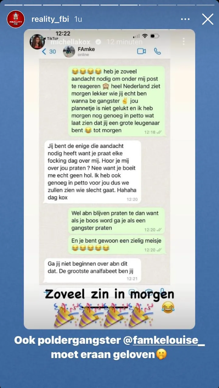 Michella Kox besloot Famke Louise te appen in aanloop van de reünie en het ziet er niet naar uit dat we geen verzoening kunnen verwachten: