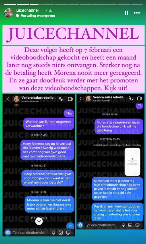 JuiceChannel deelde daarna twee voorbeelden van mensen die zich opgelicht voelde door Morena, na aanschaf kregen zij niks meer van de influencer te horen nadat zij aangaf dat zij voor een tijdje afwezig zou zijn op sociale media.