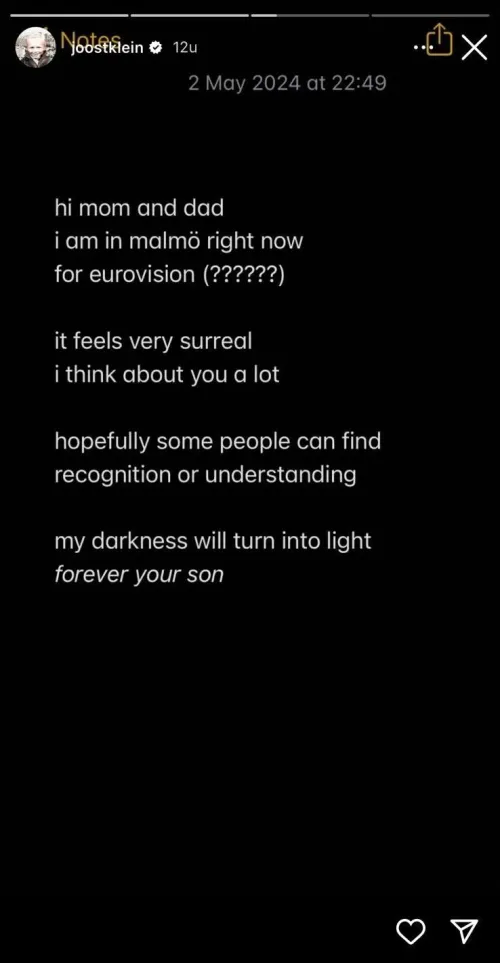 Joost deelt dat hij hoopt dat mensen zich kunnen herkennen in het nummer en in zijn optreden. “Hopefully some people can find recognition or understanding”, typt hij in de