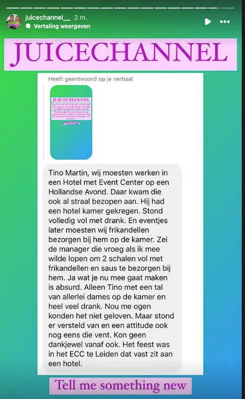 "Tino Martin, wij moesten werken in een hotel met Event Center op een Hollandse Avond. Daar kwam die ook al straal bezopen aan. Hij had een hotelkamer gekregen. Stond volledig vol met drank. En eventjes later moesten wij frikandellen bezorgen bij hem op de kamer. Zei de manager die vroeg als ik mee wilde lopen om 2 schalen vol met frikandellen en saus te bezorgen bij hem. Ja wat je nu gaat mee maken is absurd. Alleen Tino met een tal van allerlei dames op de kamer en heel veel drank. Nou me ogen konden hiet niet geloven. Maar stond er versteld van en een attitude ook nog eens die vent. Kon geen dankjewel vanaf ook. Het feest was in het ECC te Leiden dat zit vast aan een hotel".