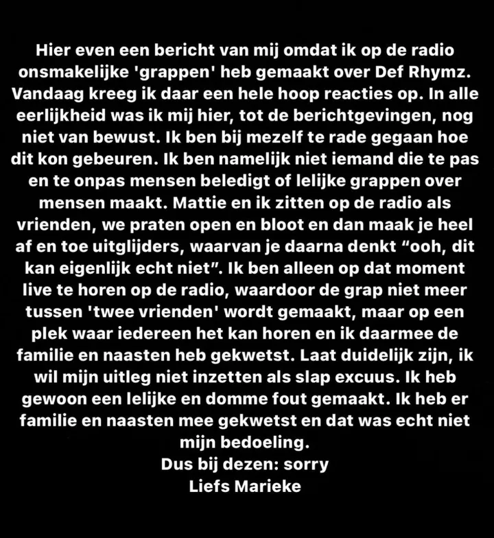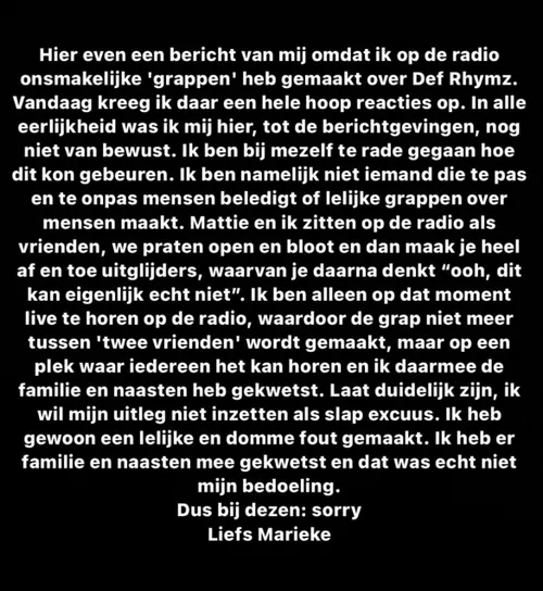 Qmusic kreeg op sociale media heel veel kritiek op haar opmerkingen. In haar Instagram Stories schrijft Elsinga dat ze een "lelijke en domme fout" heeft begaan.