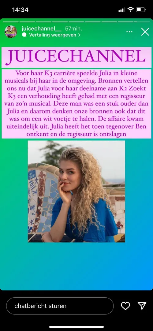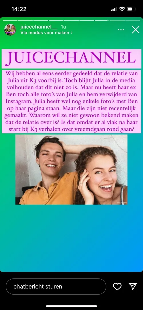 Juicechannel speculeert dat de relatie van K3'tje Julia Boschman voorbij is. Tijdens de première van de nieuwe K3 musical 'De 3 Biggetjes', was Julia haar vriend Ben Broek niet te zien op de persfoto's. Daarnaast zijn alle foto's van het koppel van Ben zijn Instagram verwijderd en bij Julia staan er ook geen recente foto's meer van de twee. Het internet speculeert er sindsdien op los, maar er is nog geen officiële bevestiging van een breuk.