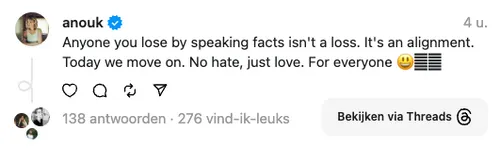 Anouk lijkt geen spijt te hebben van haar uitspraak, ze deelde gisteren een Thread met de tekst 'Iedereen die je verliest door feiten te spreken, is geen verlies. Het is een uitlijning. Vandaag gaan we verder.’