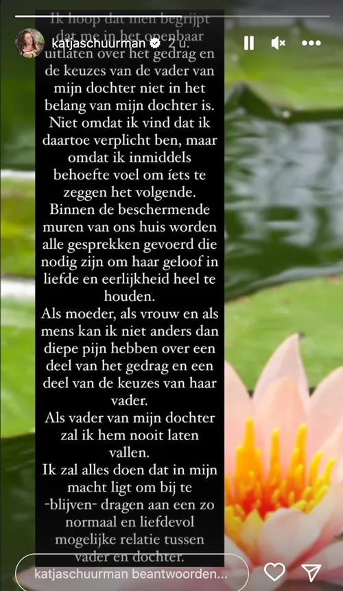 "Ik hoop dat men begrijpt dat me in het openbaar uitlaten over het gedrag en de keuzes van de vader van mijn dochter niet in het belang van mijn dochter is. Niet omdat ik vind dat ik daartoe verplicht ben, maar omdat ik inmiddels behoefte voel om iets te zeggen het volgende. Binnen de beschermende muren van ons huis worden alle gesprekken gevoerd die nodig zijn om haar geloof in liefde en eerlijkheid heel te houden. Als moeder, als vrouw en als mens kan ik niet anders dan diepe pijn hebben over een deel van het gedrag en een deel van de keuzes van haar vader. Als vader van mijn dochter zal ik hem nooit laten vallen. Ik zal alles doen in mijn macht ligt om bij te -blijven- dragen aan een normaal en liefdevol mogelijke relatie tussen vader en moeder".