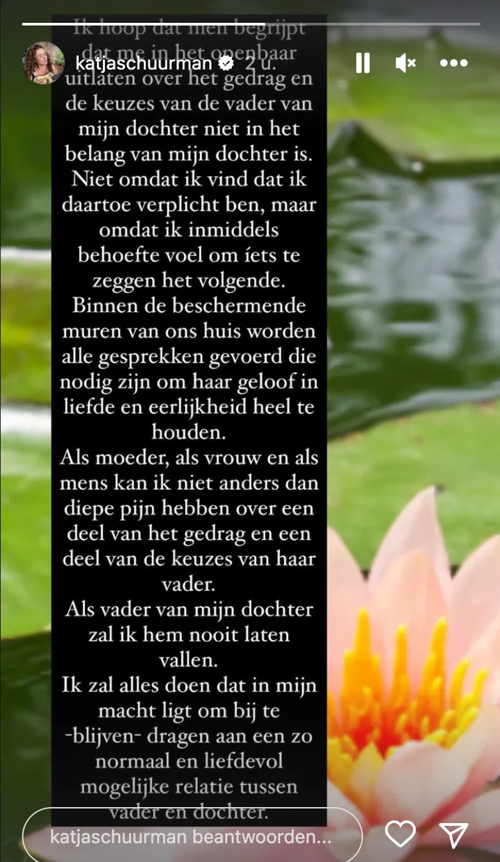 Thijs Römer heeft zelf een dochtertje met zijn ex-vriendin, Katja Schuurman. De actrice sprak zich voorheen niet uit over de zaak maar besloot dit vandaag wel te doen. De 48-jarige deelde op haar Instagram Story een statement: