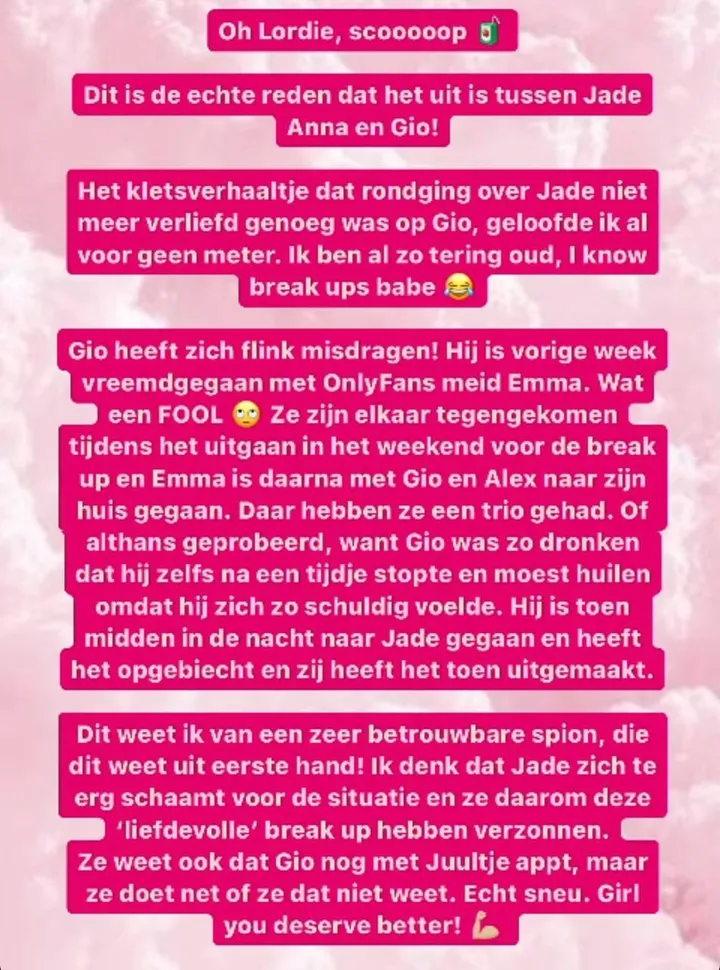 “Het kletsverhaaltje dat rondging over Jade die niet meer verliefd genoeg was op Gio, geloofde ik al voor geen meter. Ik ben al zo oud, I know break-ups babe”