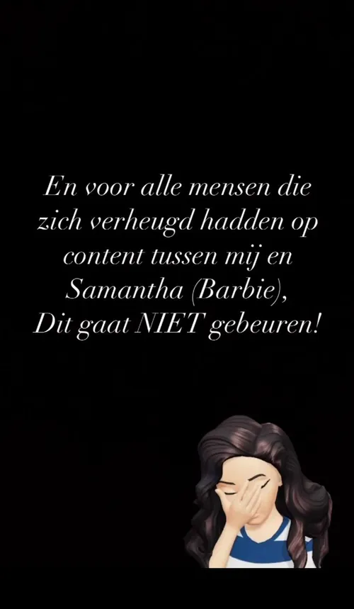 "En voor alle mensen die zich verheugd hadden op content tussen mij en Samantha (Barbie). Dit gaat NIET gebeuren!", schrijft Nicol Kremers in haar story. Bekijk de story hieronder.