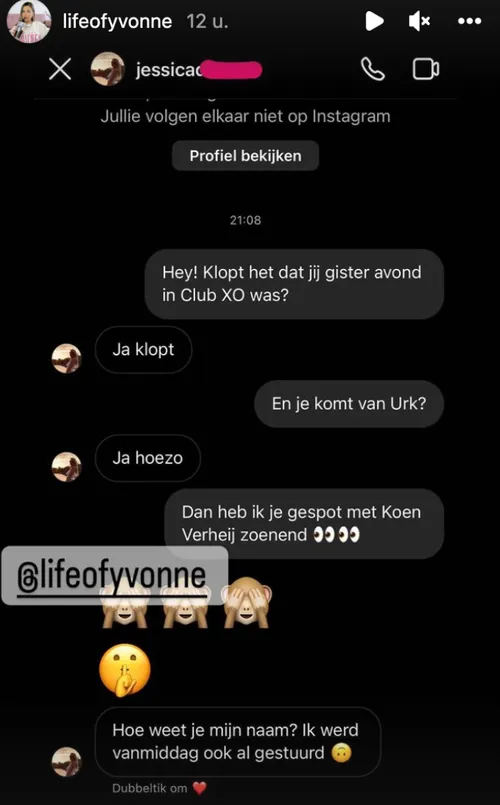 In een volgende story deelt Yvonne een screenshot van een gesprek met Jessica waarin ze toegeeft dat Koen met haar is vreemdgegaan. "Ook barpersoneel van club XO heeft dit zojuist aan mij bevestigd”, aldus Yvonne.