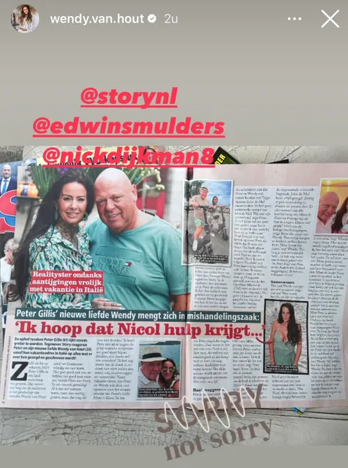 Het doet Wendy veel pijn dat er voortdurend negatief over Peter wordt bericht, en zijn ex-vriendin Nicol geen moment onbenut laat om zich negatief over hem in de media te uiten. ‘Wat Nicol allemaal naar buiten brengt, begint behoorlijk te vervelen,’ zegt Wendy tegen Story. ‘Het wordt steeds ongeloofwaardiger. Ik ben het echt zat!'