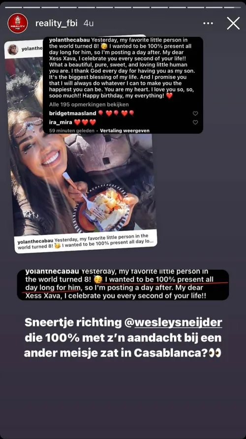 gespot . Toen dat eenmaal naar buiten kwam, werd het geplaatste bericht ook snel weer verwijderd van het account. Yolanthe deelde een dag later de foto met de tekst:'Yesterday, my favorite little person in the world turned 8! I wanted to be 100% present all day long for him, so I'm posting a day after. Volgens Juice-channel's Reality FBI lijkt de laatste zin te wijzen op een sneer naar Wesley Sneijder. Het Juice-channel merkt op: 'Sneertje richting @wesleysneijder die 100% met z'n aandacht bij een ander meisje zat in Casablanca?'