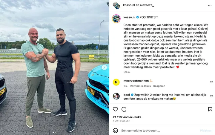 De ruzie begon allemaal na een post van Kosso die beelden deelde van een autoinbraak. Kosso was op vakantie en beroofd van behoorlijk wat dure spullen, het zou om duizenden euro's gaan. Alex Soze moest lachen om Kosso's post en bood hem zelfs een tientje aan.