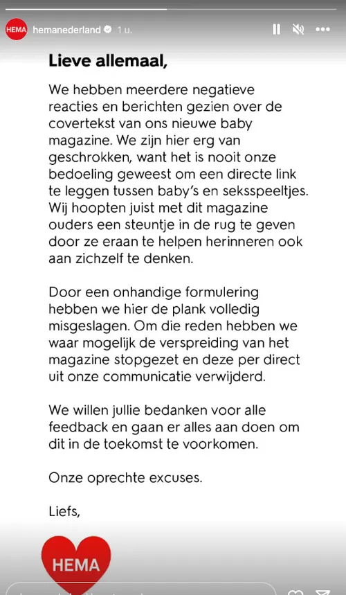 "We hebben meerdere negatieve reacties en berichten gezien over de covertekst van onze nieuwe babymagazine. We zijn hier erg van geschrokken, want het is nooit onze bedoeling geweest om een directe link te leggen tussen baby's en s*ksspeeltjes. Wij hoopten juist met dit magazine ouders een steuntje in de rug te geven door ze eraan te helpen herinneren ook aan zichzelf te denken.