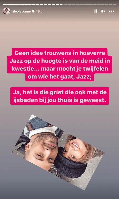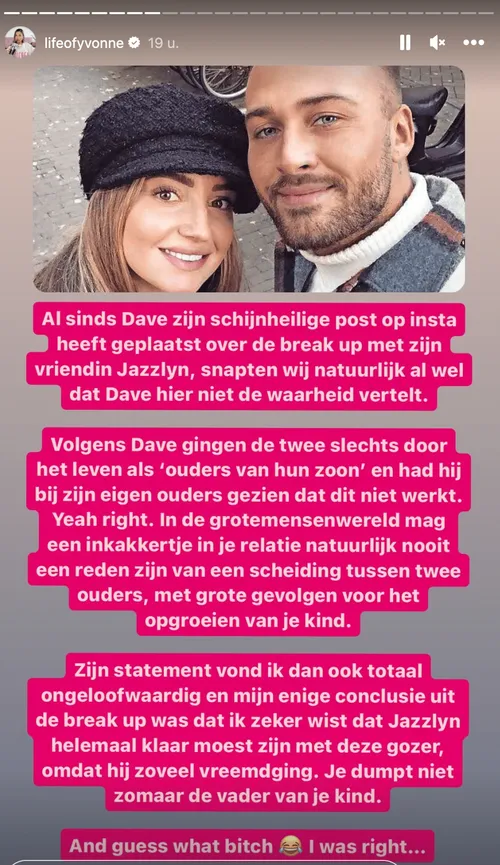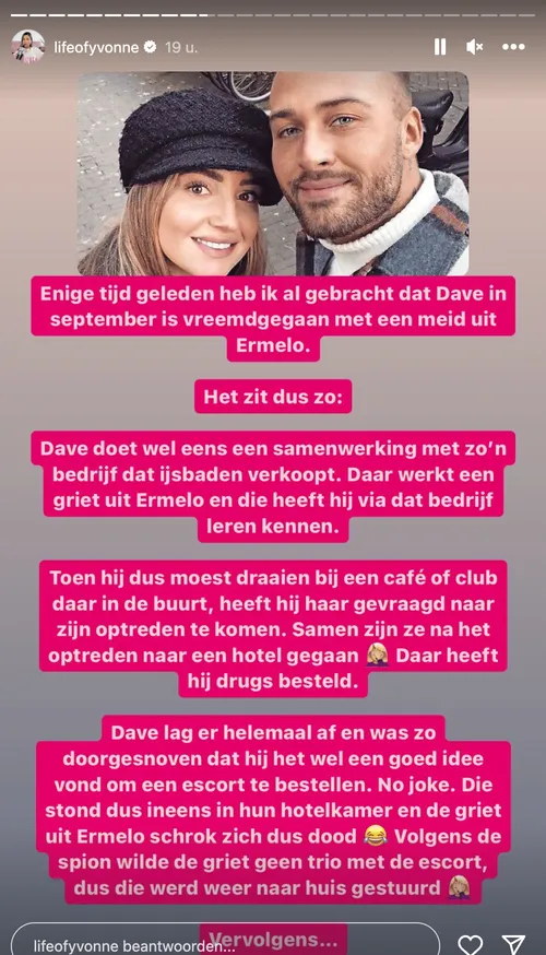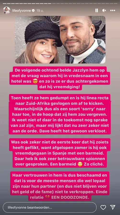"Zijn statement vond ik dan ook totaal ongeloofwaardig en mijn enige conclusie uit de breakup was dat ik zeker wist dat Jazzlyn helemaal klaar moest zijn met deze gozer, omdat hij zoveel vreemdging. Je dumpt niet zomaar de vader van je kind. Enige tijd geleden heb ik al gebracht dat Dave in september is vreemdgegaan met een meid uit Ermelo. Het zit dus zo: Dave doet wel eens samenwerkingen met zo'n bedrijf dat ijsbaden verkoopt. Daar werkt een griet uit Ermelo en die heeft hij via dat bedrijf leren kennen. Toen hij moest draaien bij een café of club daar in de buurt, heeft hij haar gevraagd naar zijn optreden te komen. Samen zijn ze na het optreden naar een hotel gegaan. Daar heeft hij drugs besteld. Dave lag er helemaal af en was zo doorgesnoven dat hij het een goed idee vond om een escort te bestellen. No joke. Die stond dus ineens in hun hotelkamer en de griet uit Ermelo schrok zich dus dood. Volgens de spion wilde de griet geen trio met de escort, dus die werd weer naar huis gestuurd".